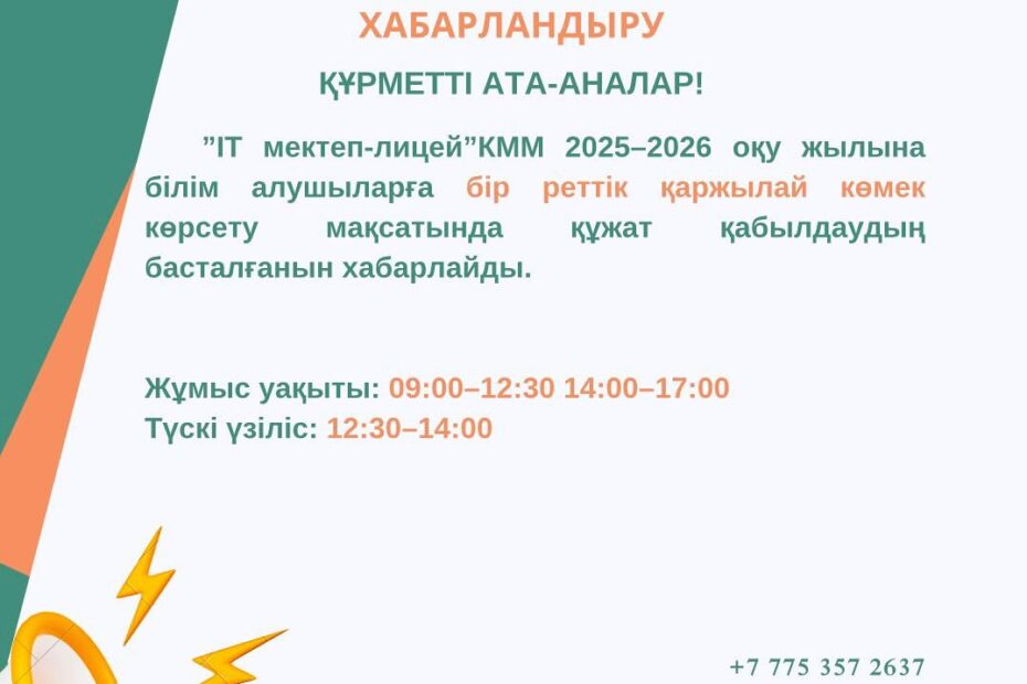 ”ІТ мектеп-лицей”КММ 2025–2026 оқу жылына білім алушыларға бір реттік қаржылай…